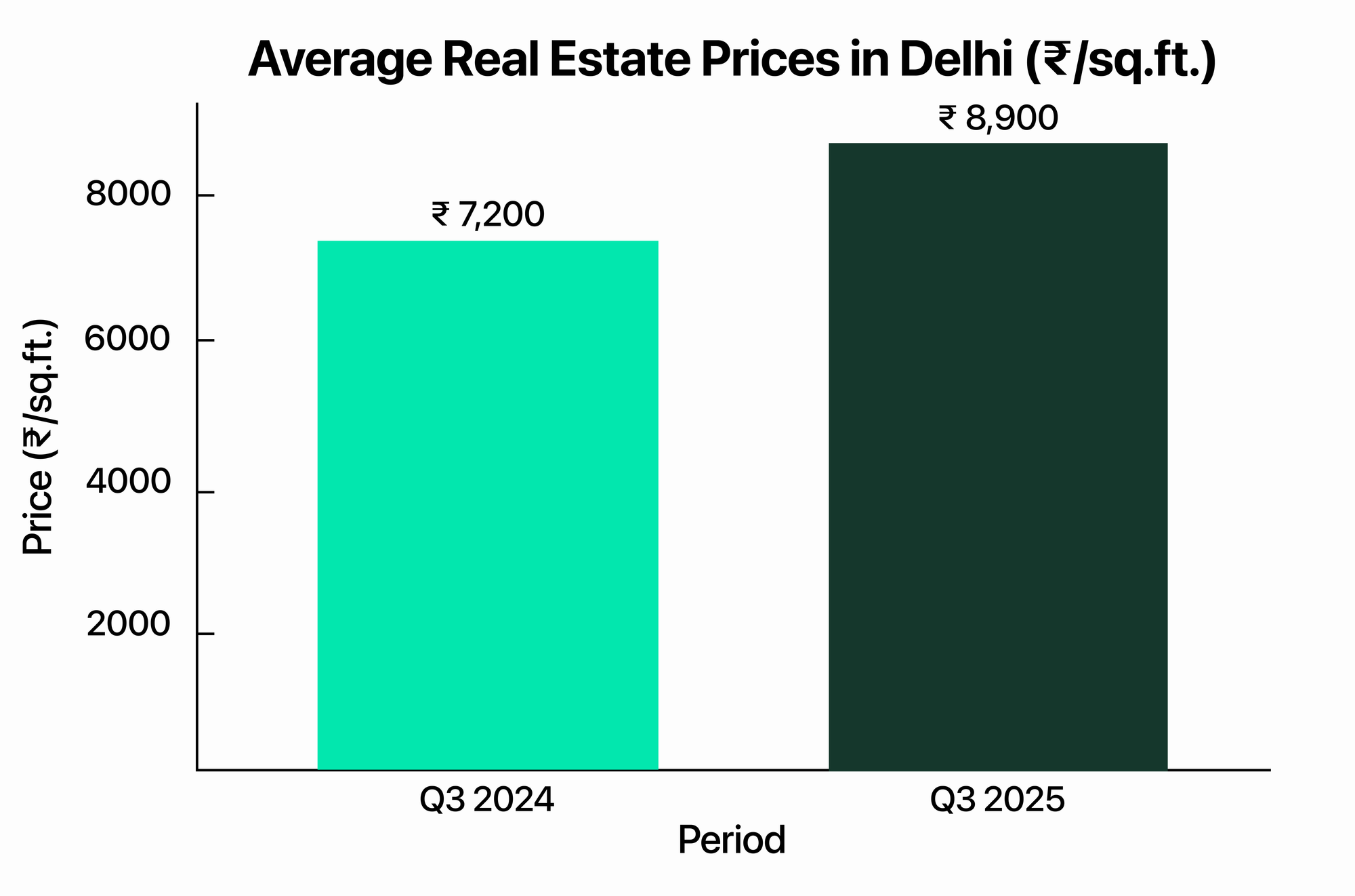 Recent industry reports show Delhi-NCR posting the steepest annual housing price increase among India's major cities in Q3 2025. Average asking rates rose to about ₹8,900 per sq. ft. in July-September 2025, up from roughly ₹7,200 a year earlier, a near 24% year-on-year jump driven largely by luxury demand and concentrated new supply.